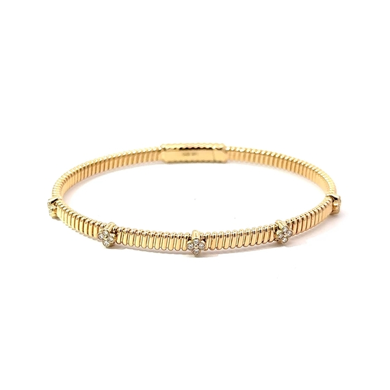 A soft bangle bracelet with 5 four-leaf stations. Available in 14k white and 14k gold, there are 20 full cut diamonds with a total carat weight of 0.29 ct.