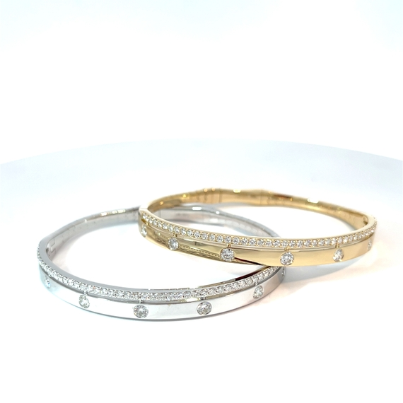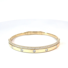 A soft bangle bracelet with diamond accents. Available in 14k white and 14k gold, there are 9 full cut diamonds with a total carat weight of 0.45 ct.