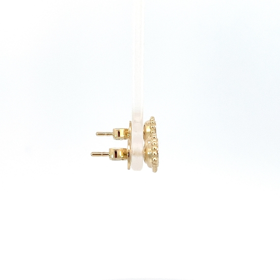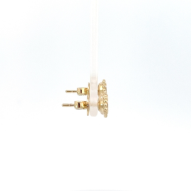 Beautiful gold and white mother of pearl studs, each accented with a diamond. The 2 full cut diamonds total 0.06 ct, and the studs measure 10mm across.