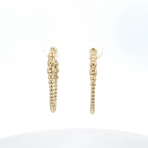 Beautiful round gold hoop earrings, with gold beads and 8 full cut diamonds set in a butterfly shape. The diamonds total 0.17 ct, and the hoops measure 0.75" across.