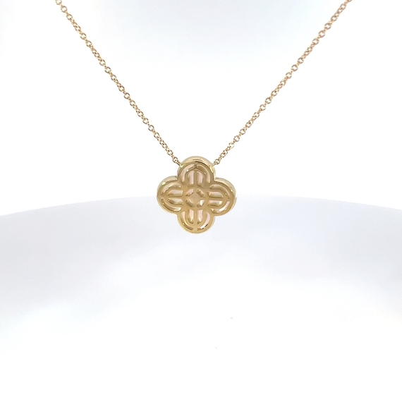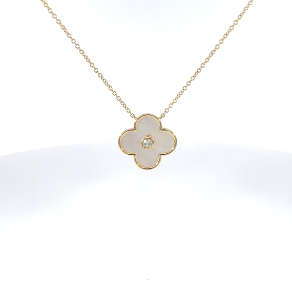 A beautiful four leaf pendant necklace. The pendant is made of white mother of pearl, with a 0.06 ct full cut diamond in the center, and has an 18 inch chain attached.