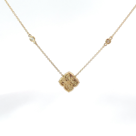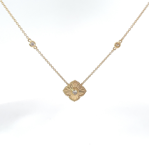 A beautiful miracle cut four leaf necklace. There are 5 full cut diamonds with a total carat weight of 0.13 ct. The cost includes an 18 inch chain.