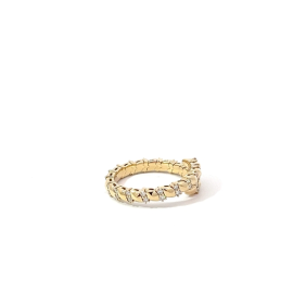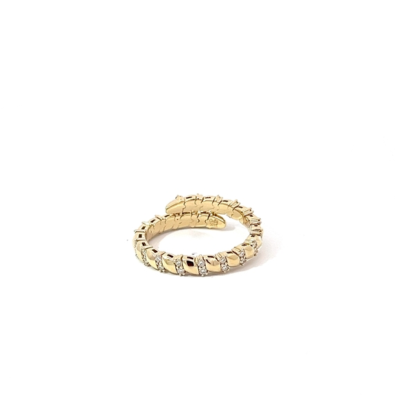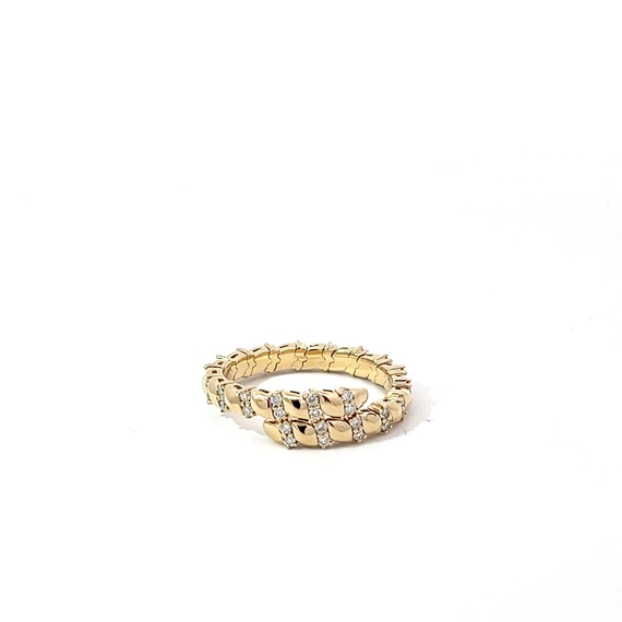 A flexible gold and diamond wrap ring. There are 46 full cut diamonds, totaling 0.34 ct. The ring flexes to fit sizes 6 to 8.